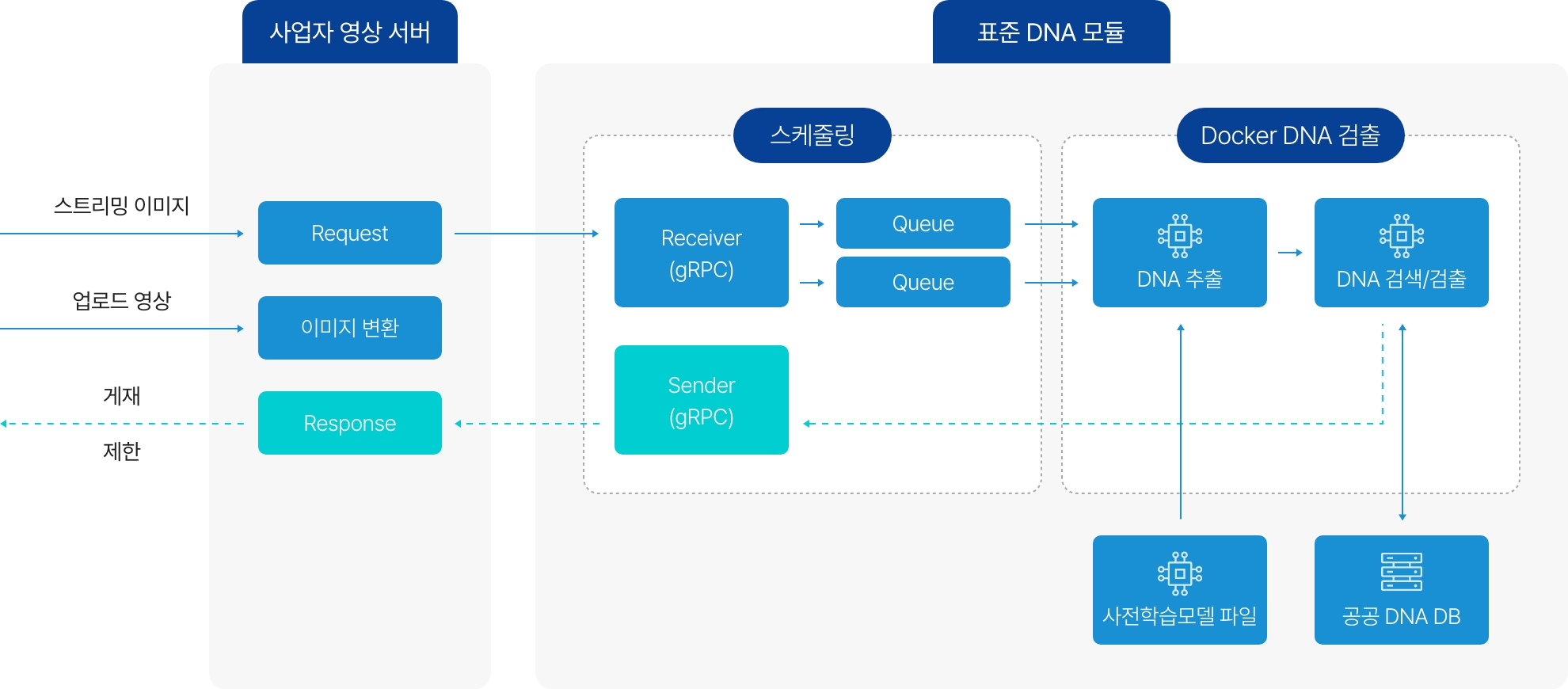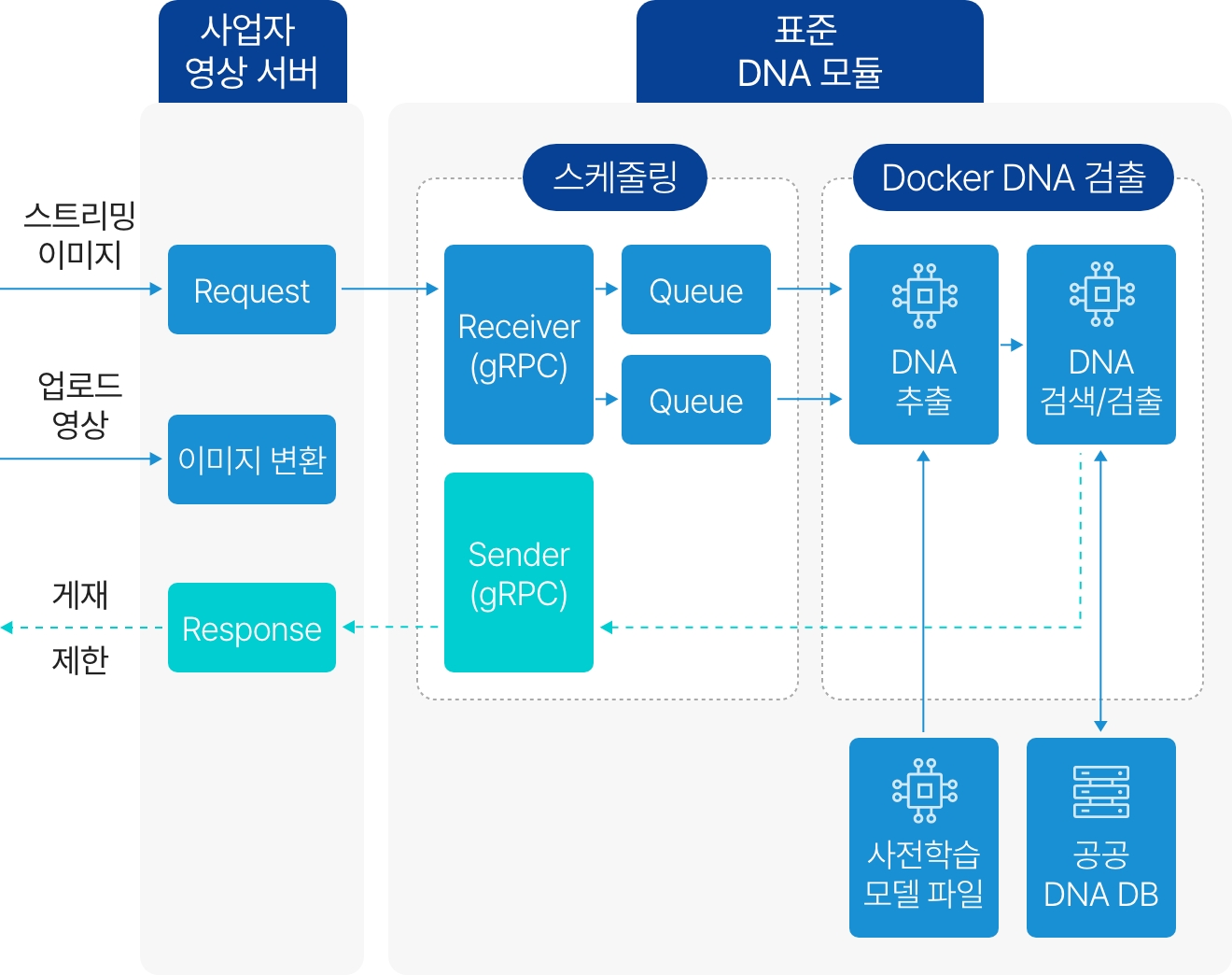 불법으로 촬영된 디지털성범죄 영상, 음란물 등의 유포·확산 방지를 위해 국가기관에서 개발한 영상 고유의 특징값(DNA)을 추출/검출하여 방송통신심의위원회에서 제공하는 불법촬영물 데이터(공공 DNA DB)와 비교·식별을 통해 불법촬영물 유통 제한 및 차단에 활용하는 기술